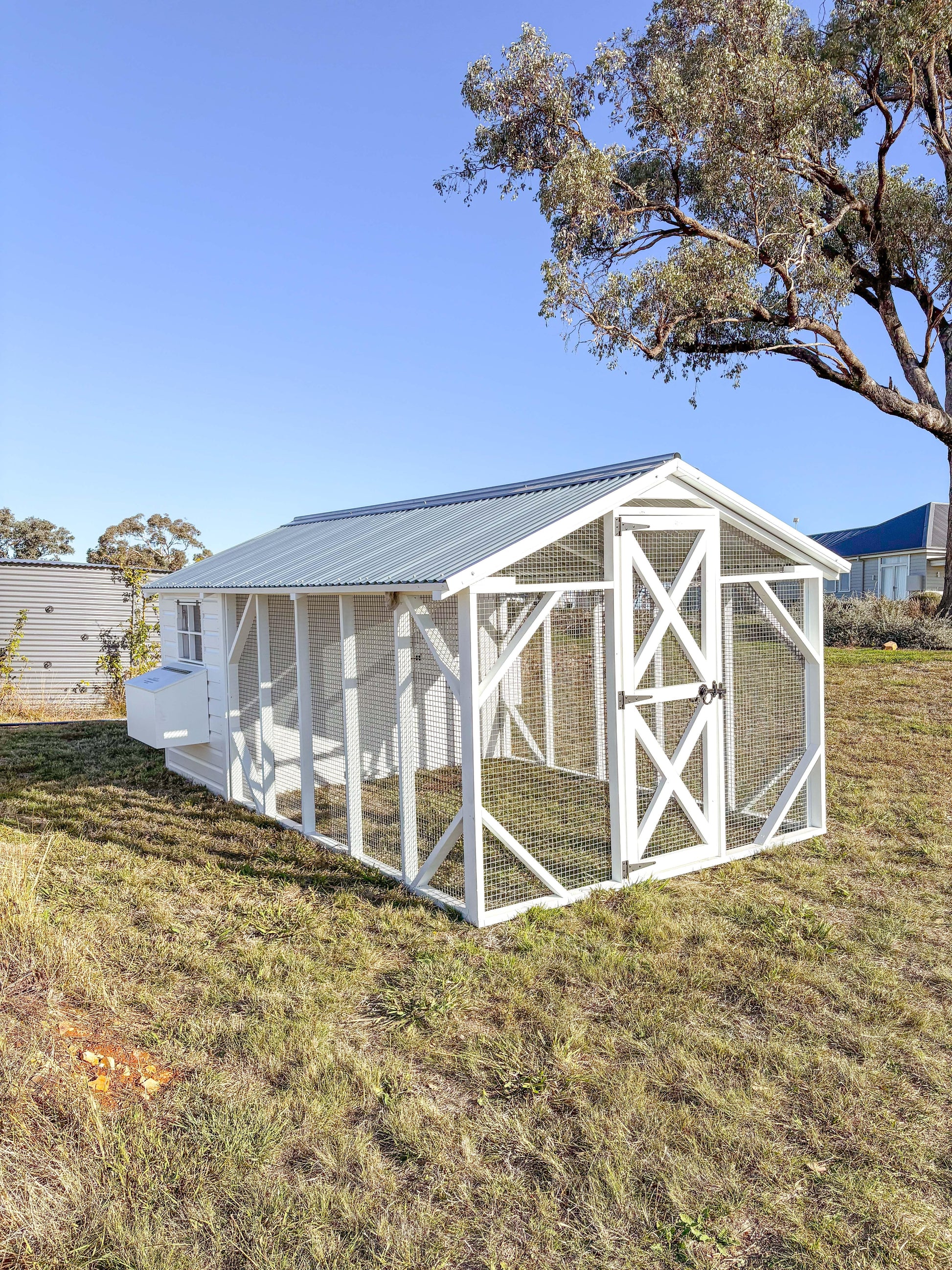 Dimensions: 4.5m (L) x 2.4m (W) Enclosed coop 1.5m (D) x 2.4m (W) Caged area 3m (L) x 2.4 (W)