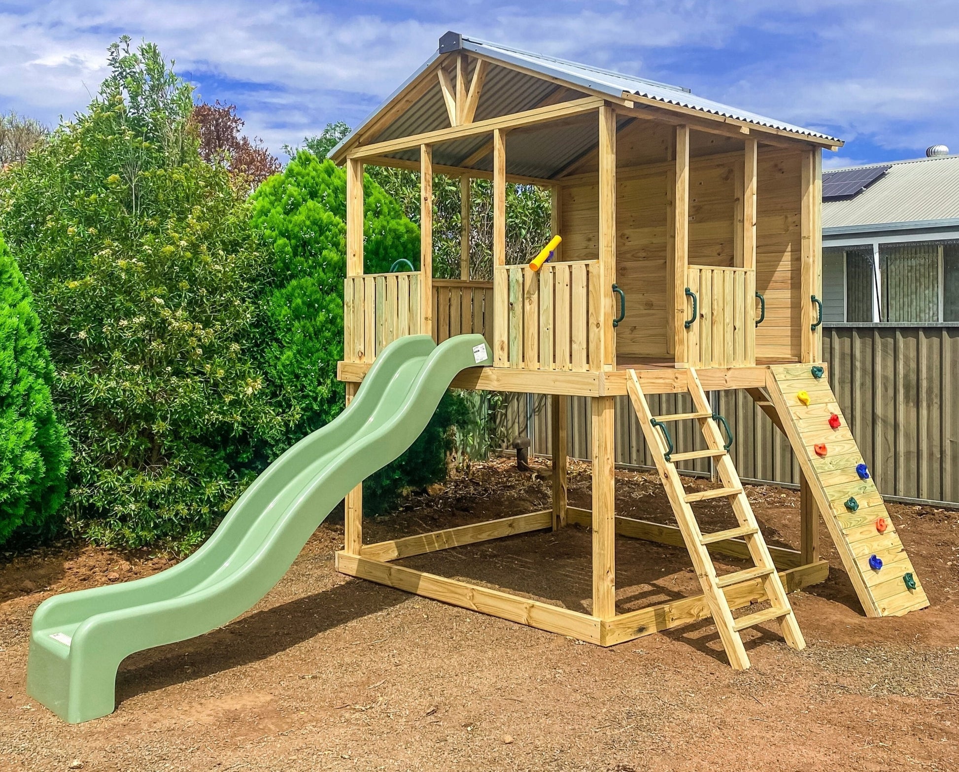 A slide can be purchased for this cubby house. Please choose fibreglass or plastic - suitable for a 1.5m elevation/platform height.
