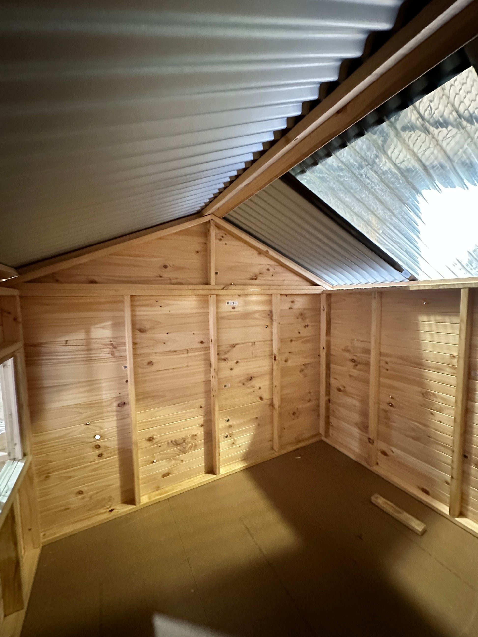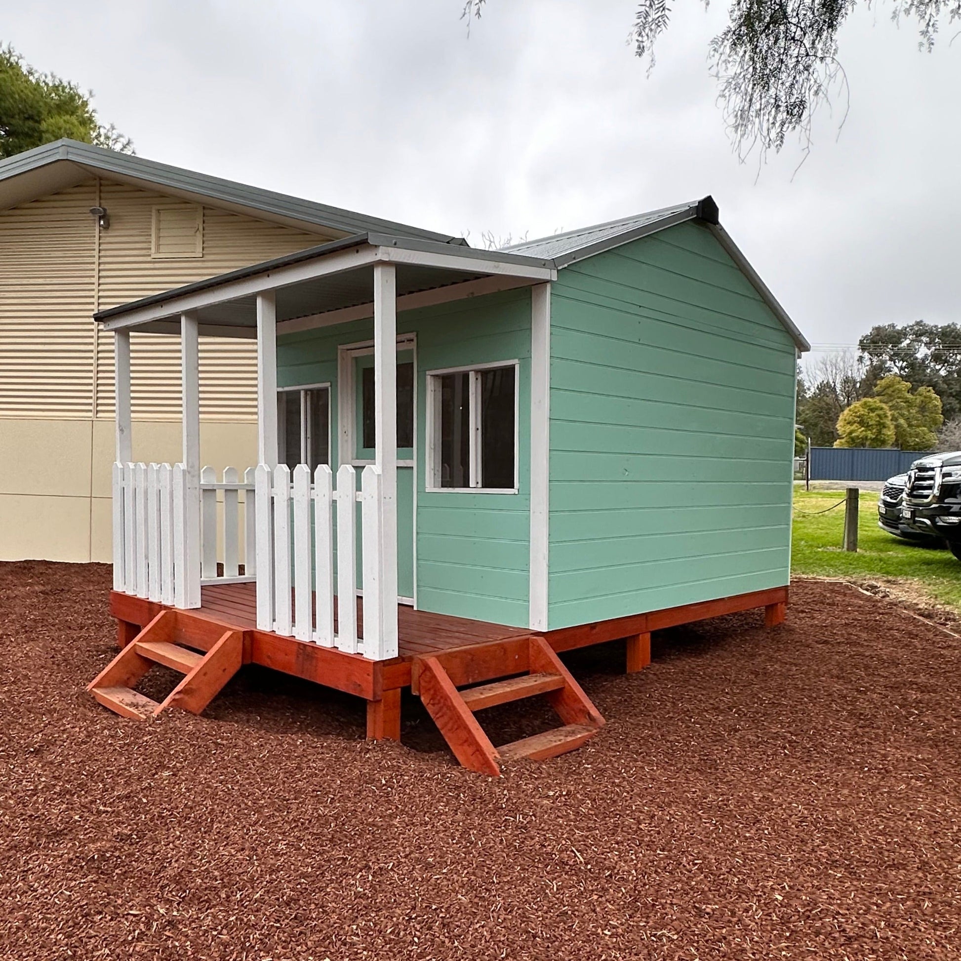 Dimensions: 2.4m Wide x 3.3m Deep (veranda 900mm deep) and the internal roof height is 2050mm High. External height including the 400mm elevation as shown in the photo is 2600mm from the ground to the roof.