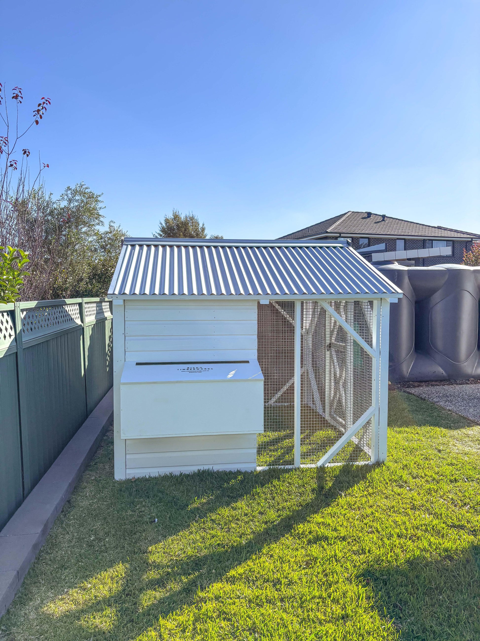 The coop is made from H3 treated pine and on the back half we have used Treated Pine Cladding, with a Zincalume roof, and heavy-duty Weldmesh Gal 25 x 25cm.