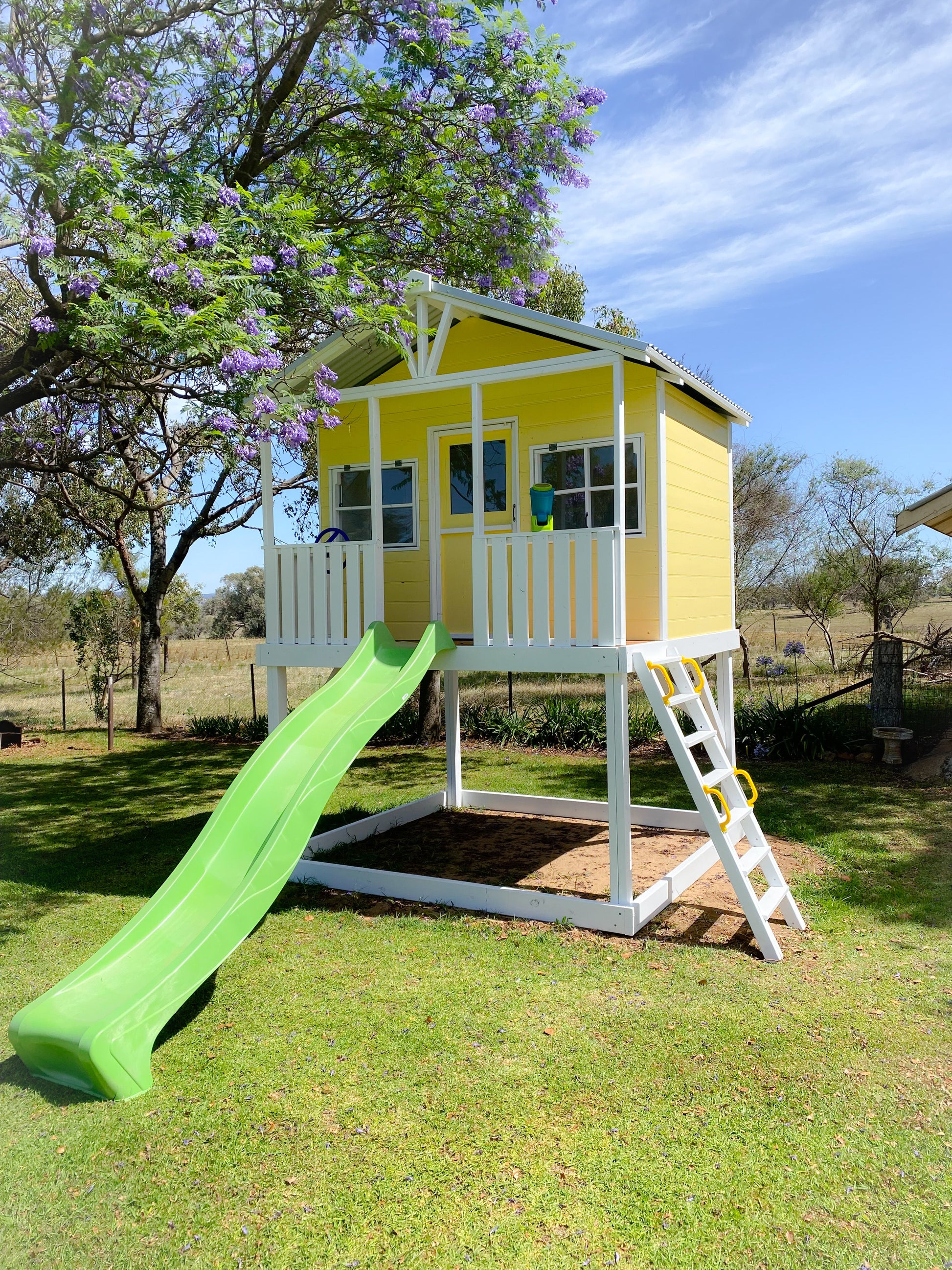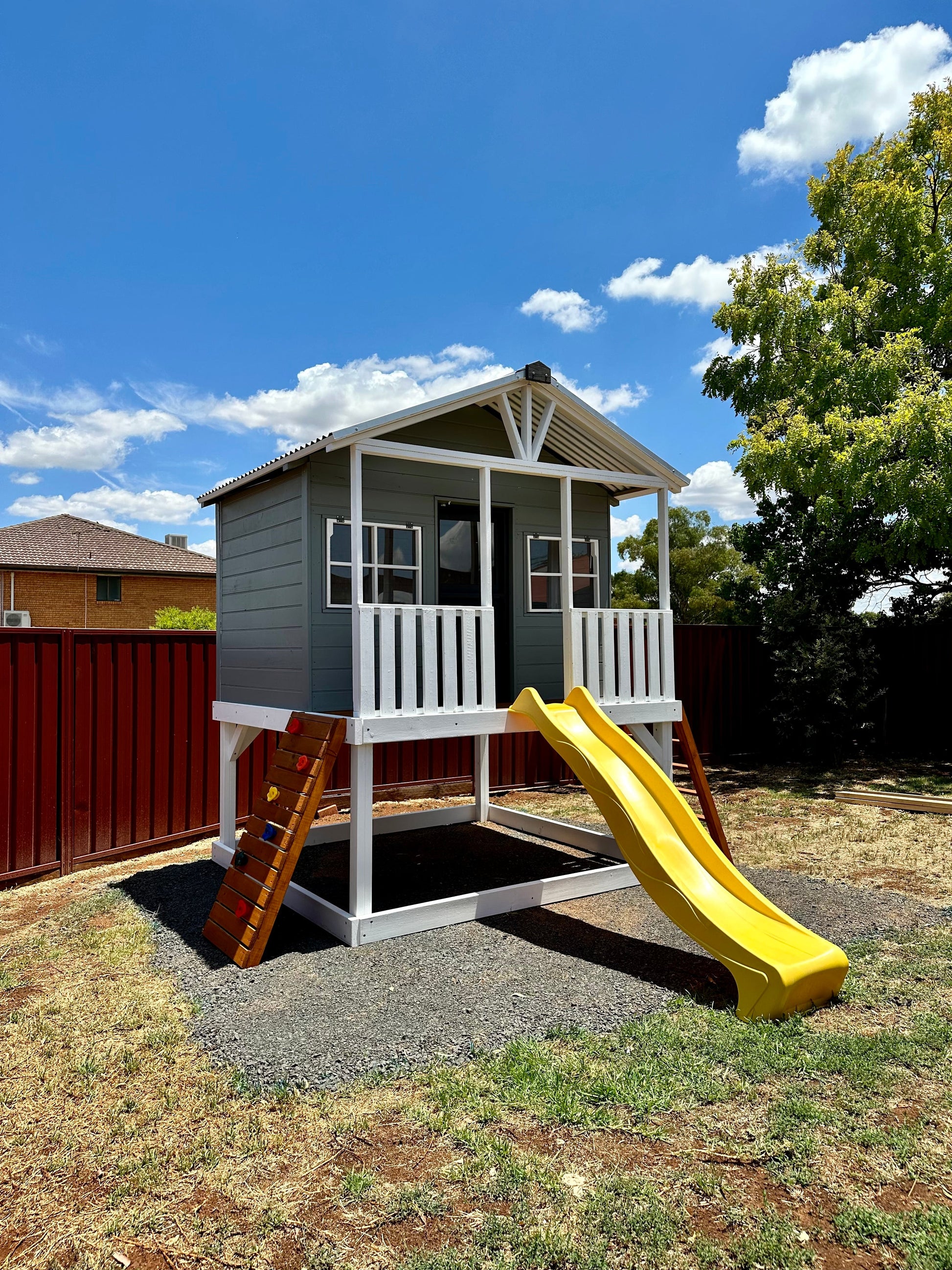 You can add a slide to your cubby house. We have available plastic and fibreglass.