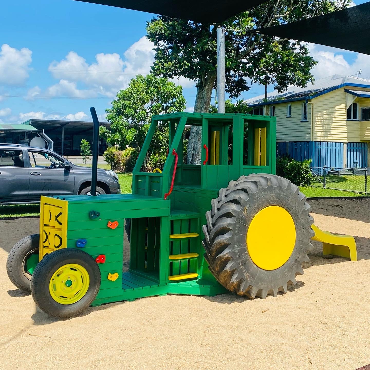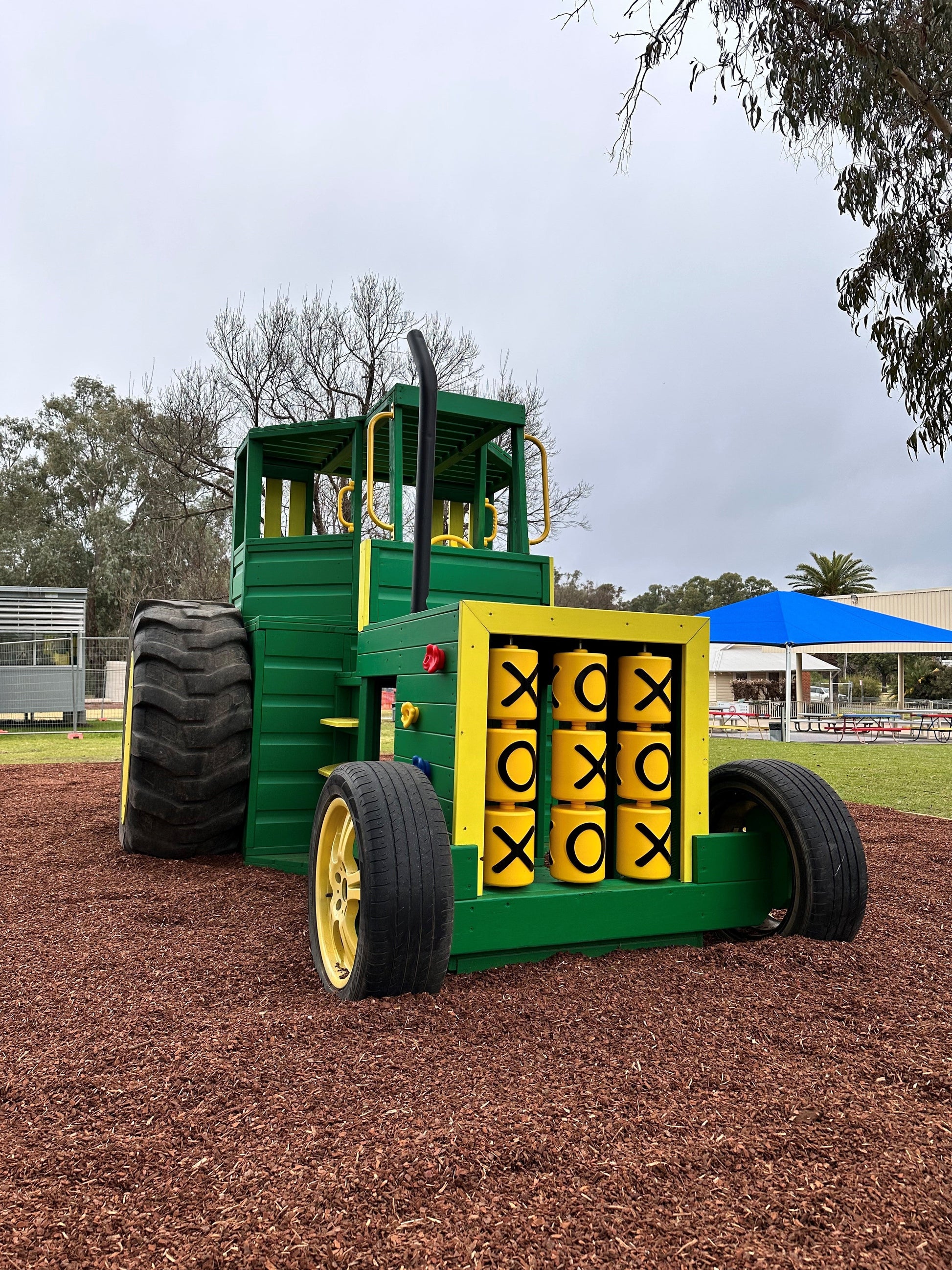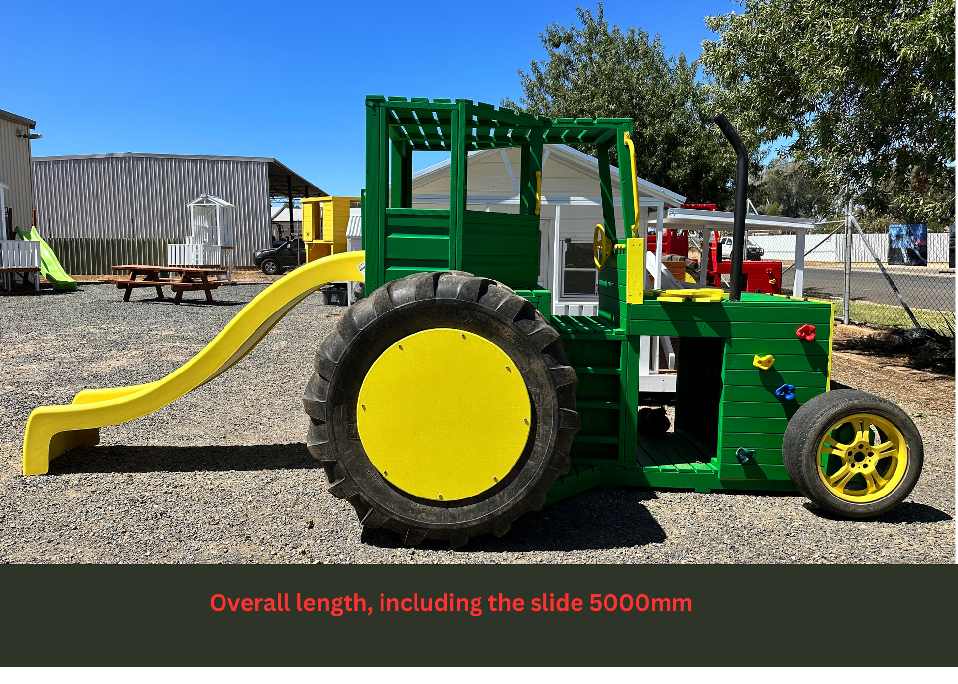 This Tractor is packed full of fun and interactive components for the kids to play on. Included in the price is a Tic-Tac-Toe in the front grill, rock wall stones, a steering wheel, handle grips and a heavy-duty Australian made fibreglass slide (colours may depend on stock availability)